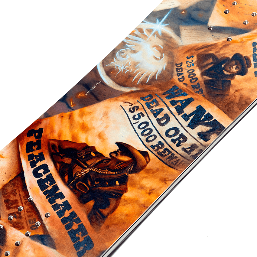 Welcome to the quadrilogy Peacemaker. This year artist Brian Henry and super-shred Dylan Alito wrap up their 4-year graphic story with the final rendering. A true masterpiece created from Brian’s full-size oil painting. The Peacemaker is a true twin six-shooter. A soft mid-section flex gets you locked in on rails and pressing a mile high. We made the nose and tail stiffer for huge launches and incredibly stable landings. We added a Blower Stance for when the old dusty trail is covered in POW. The Peacemaker makes certain that you’re always bringing the right board to the shootout.